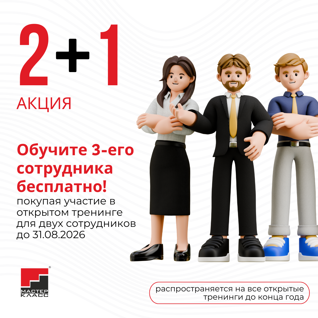 Дорогие клиенты, мы подготовили для вас выгодный способ усилить команду. Приобретая участие в открытом тренинге для двух своих сотрудников, ваш третий сотрудник сможет поучаствовать в нем бесплатно!