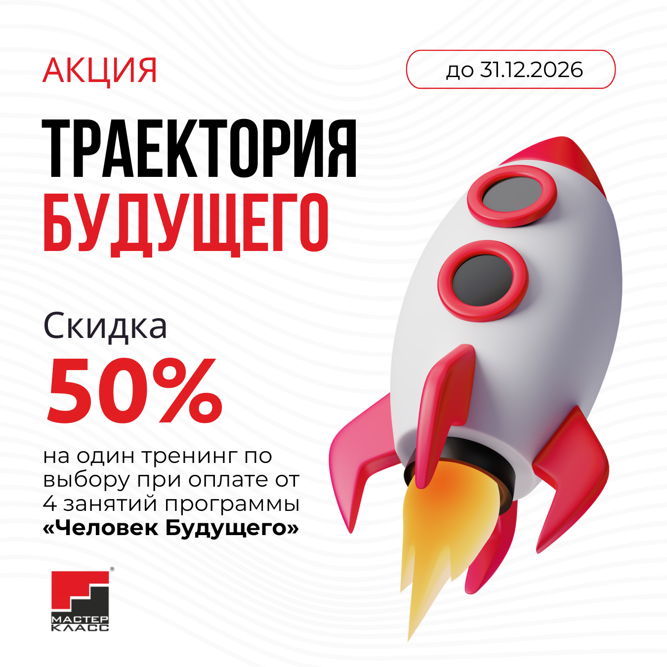 - Скидка 50% на тренинг из перечня по выбору предоставляется при оплате от 4 занятий программы «Человек Будущего» в период до 31 декабря 2026 года включительно;