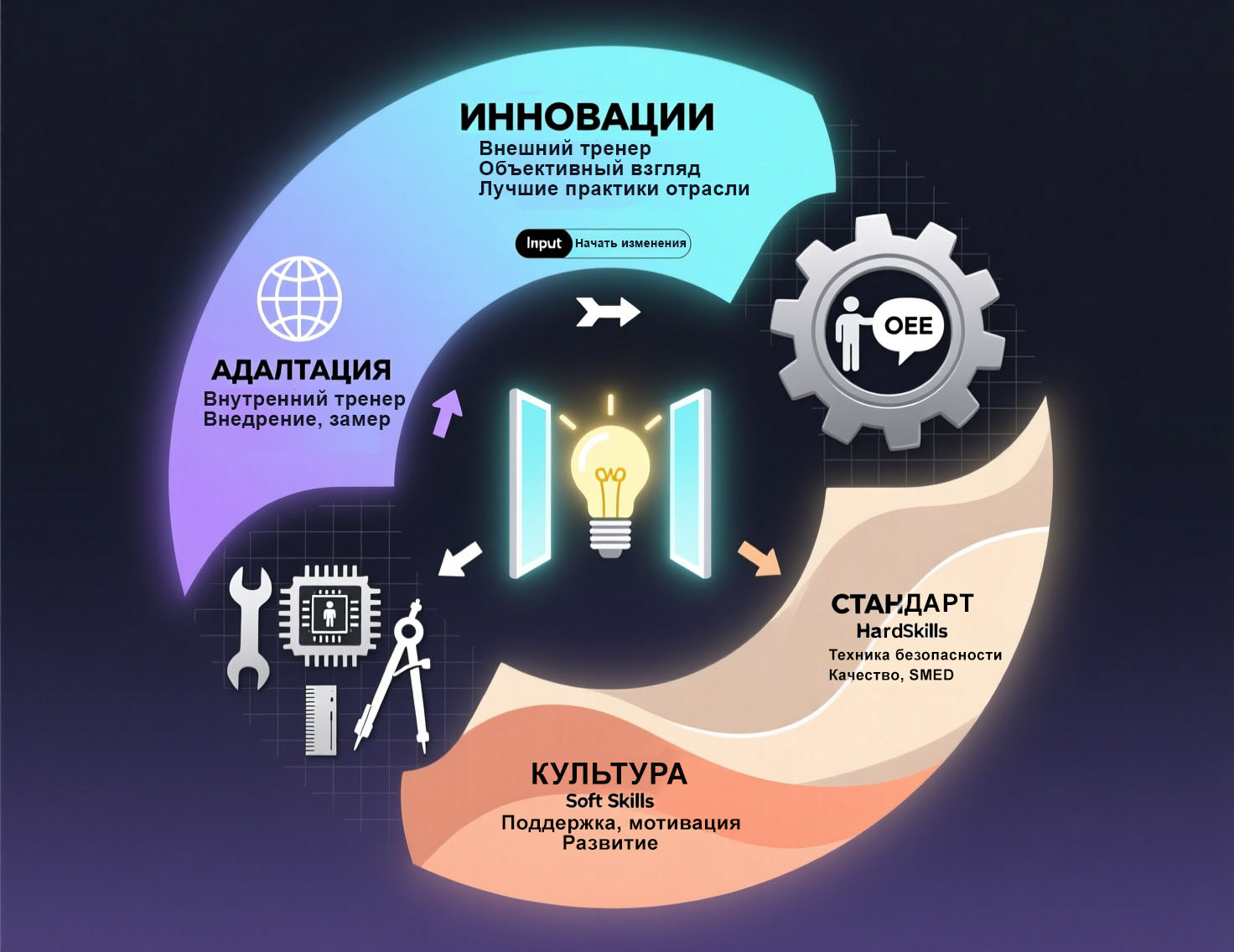 - Снижение издержек на R&D. Внешний тренер приносит «упакованные» и проверенные методологии (бережливое производство, TPM, 6 Sigma, наставничество, навыки эффективного руководства), экономя наши ресурсы на их разработку.