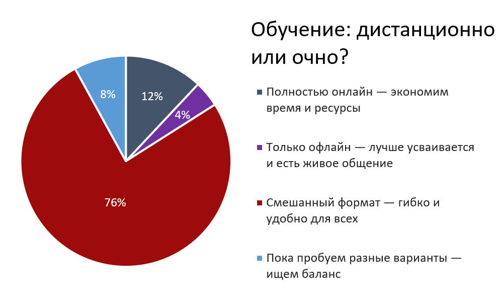 С подавляющим перевесом «победил» смешанный вариант обучения. Это гибко и удобно для всех.
