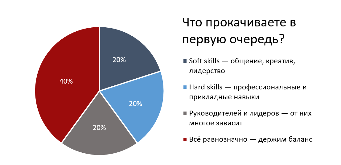 Оказывается, важнее всего не «что», а «как» – сбалансированно. То есть компании стараются уделить внимание всем аспектам обучения и развития (40% респондентов за этот путь).